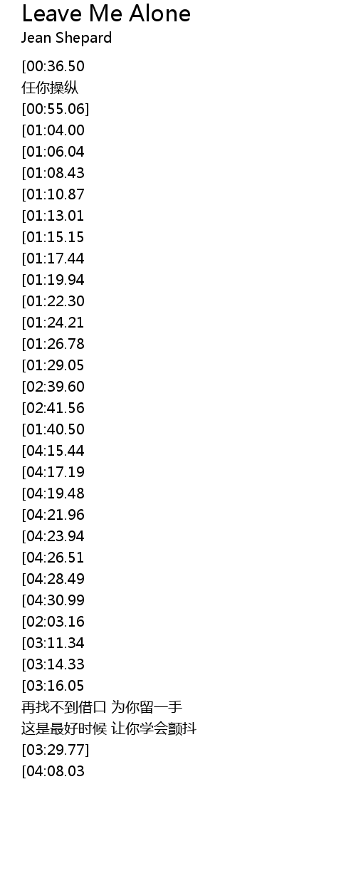 | [04:12.40][04:08.03][04:03.54][03:59.01][03:54.47] | Hey Leave Me Alone |