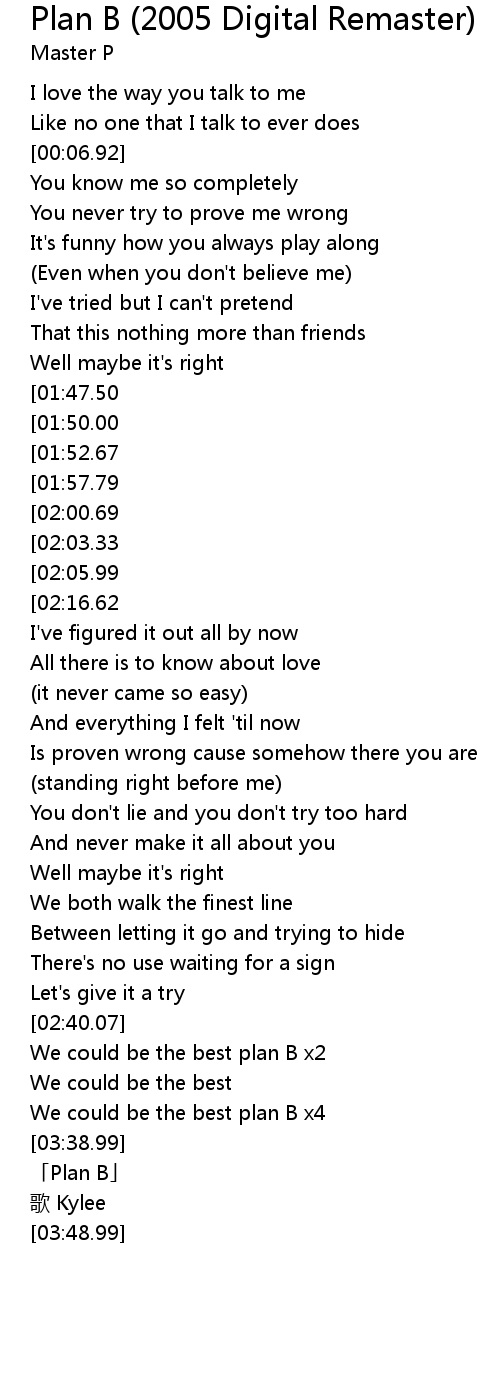 | [00:56.67][02:05.99] | We could be the best plan B x2 |