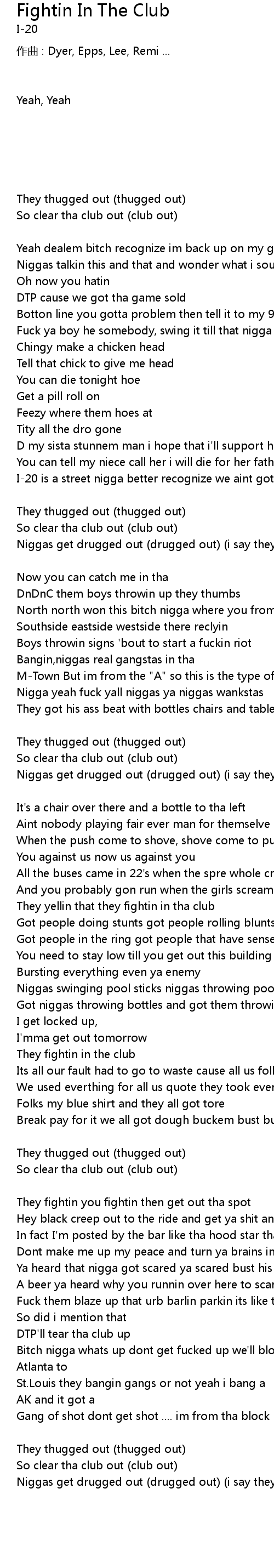 | Niggas get drugged out drugged out i say they fightin in tha club I20 | |