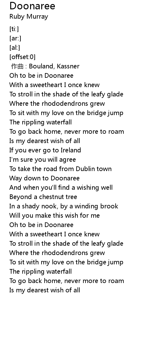 | [02:04.69] | Oh to be in Doonaree |