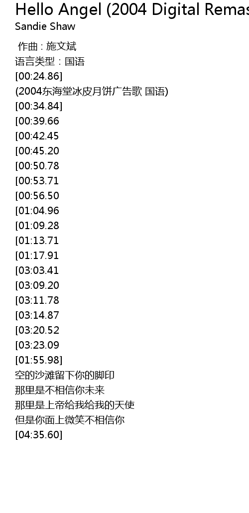 | [02:50.47][01:13.71] | 说你是上帝给我的天使 |