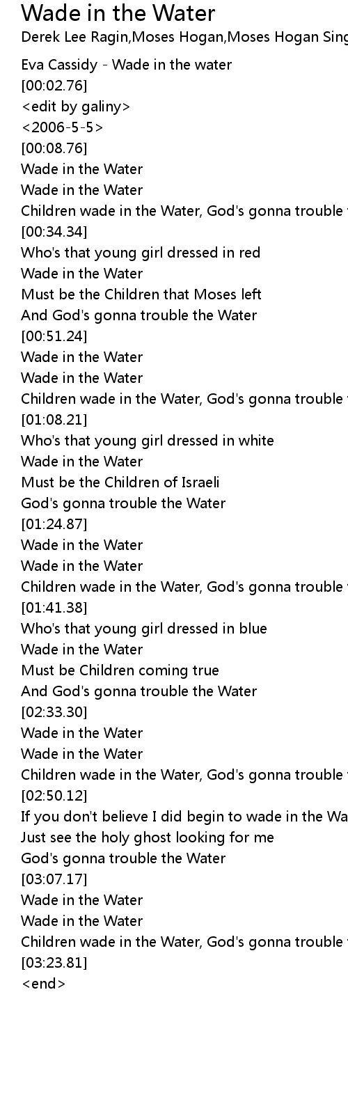 [02:41.13] Children wade in the Water, God's gonna trouble the Water