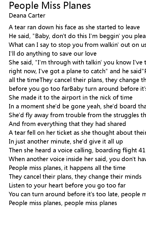 She said, "I'm through with talkin' you know I've tried my bestI gotta leave right now, I've got a plane to catch" and he said"People miss planes, it happens all the timeThey cancel their plans, they change their mindsListen to your heart before you go too farBaby turn around before it's too late, people miss planes" |