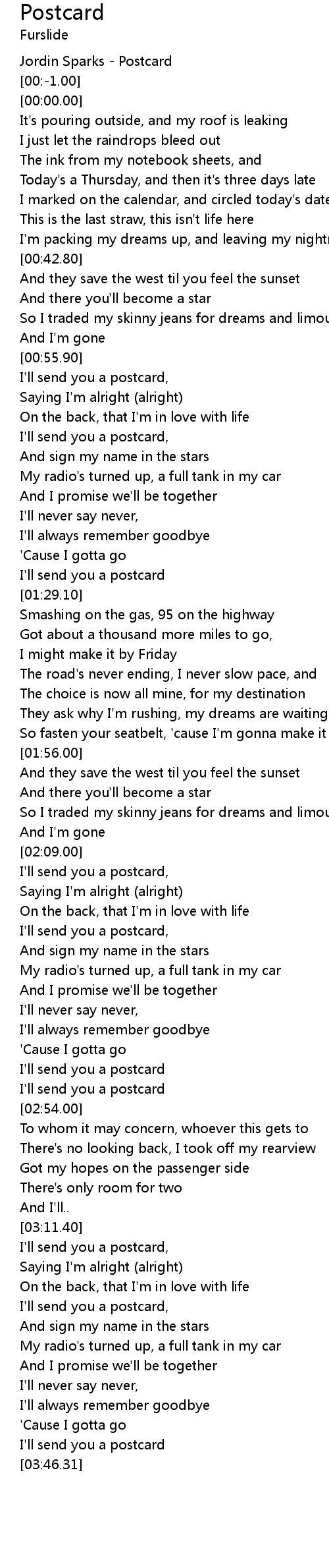 | [02:46.73] | I'll send you a postcard |