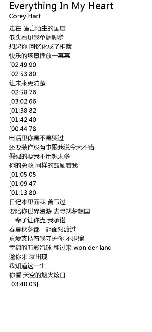 | [03:08.25][02:49.90][01:23.32][00:19.00] | 是你的 everything in my heart |