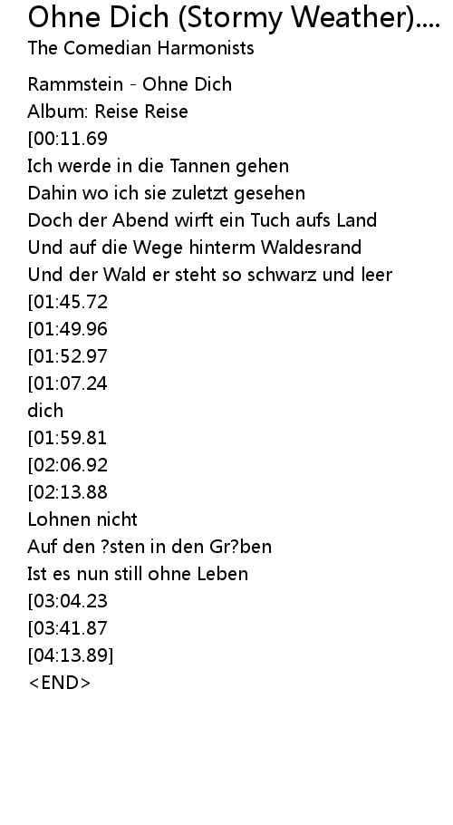 [01:00.30][01:07.24][01:56.42][02:03.35][02:47.78][03:20.78][03:27.64][03:49.01][03:55.82][04:03.05][04:09.95] Ohne dich