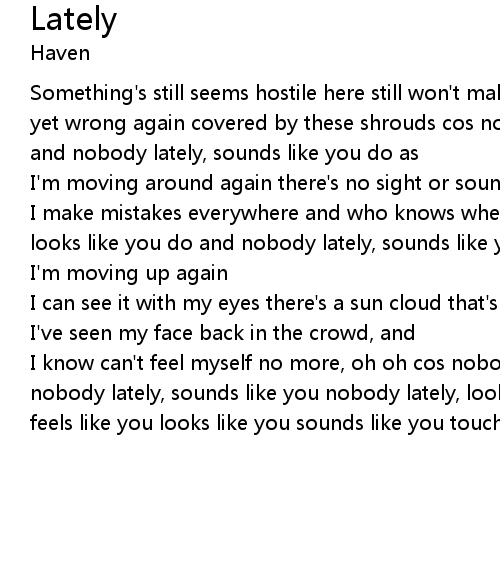 Something's still seems hostile here still won't make me proud feels so right, yet wrong again covered by these shrouds cos nobody lately, looks like you do and nobody lately, sounds like you do as |