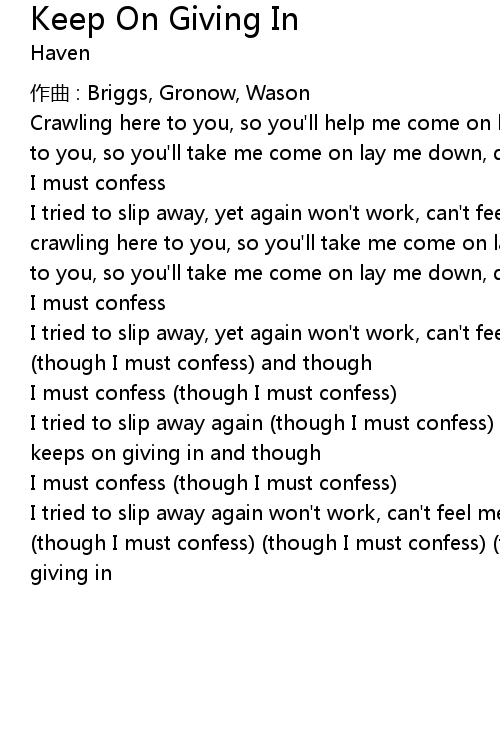 | I tried to slip away again won' t work, can' t feel me in keeps on giving in though I must confess though I must confess though I must confess keeps on giving in |