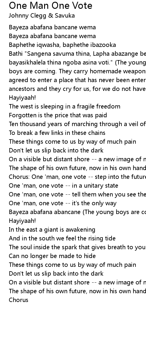 Bathi "Sangena savuma thina, Lapha abazange bengena abazali bethu Nabadala, bayasikhalela thina ngoba asina voti." (The young boys are coming, the young boys are coming. They carry homemade weapons and a bazooka. They say "We have agreed to enter a place that has never been entered before by our parents or our ancestors and they cry for us, for we do not have the right to vote.)
