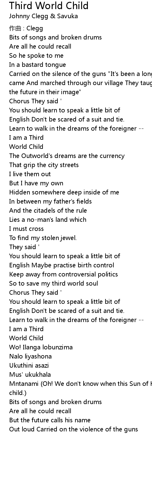 | Carried on the silence of the guns " It' s been a long long time since they first came And marched through our village They taught us to forget our past And live the future in their image" | |