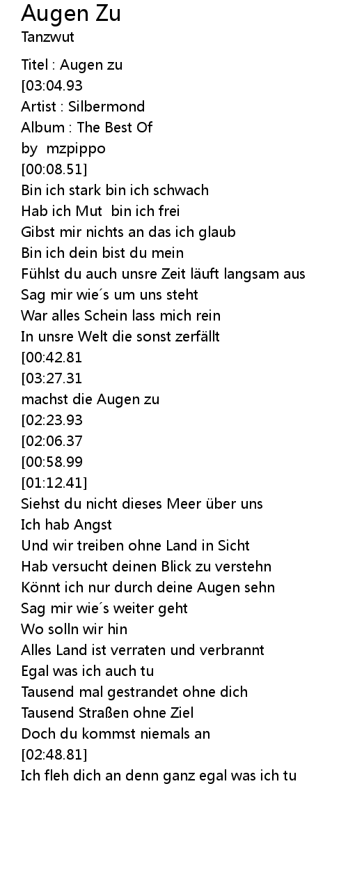 | [03:30.54][03:27.31][02:41.48][02:19.89][02:17.10][01:55.53][01:07.20][01:04.37][00:45.36] | Du machst die Augen zu |