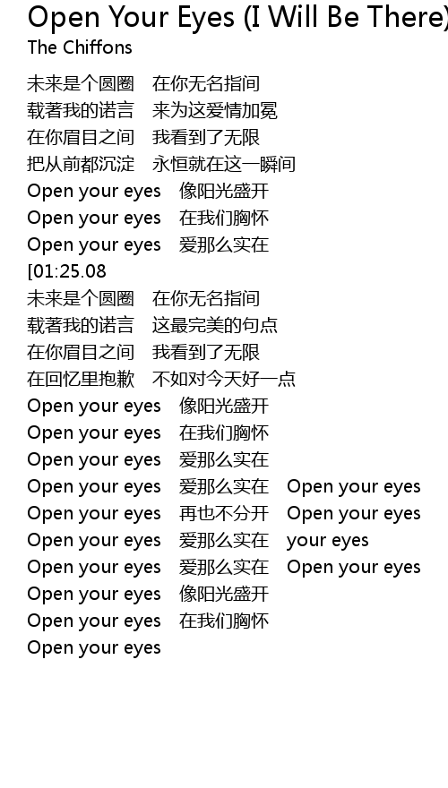 | [02:45.26][01:25.08] | Open your eyes zai mei you kong bai |