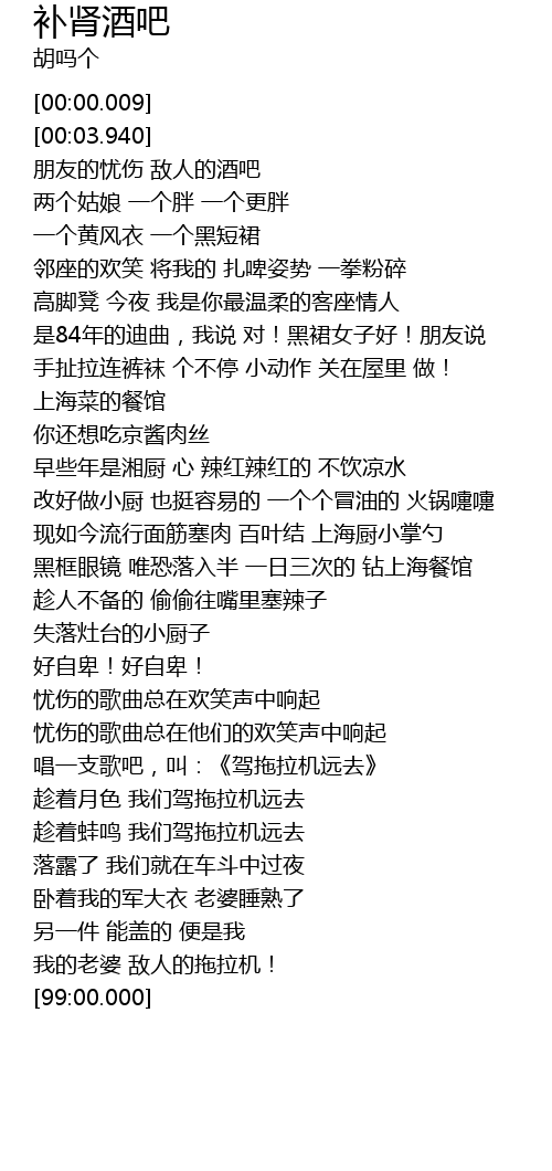 | [00:18.240] | 朋友的忧伤 敌人的酒吧 |