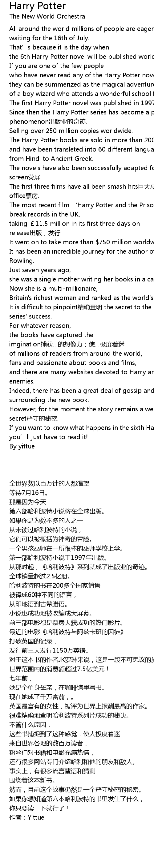 | [00:30.94] | Since then the Harry Potter series has become a publishing phenomenon chū bǎn yè de qí jī. |