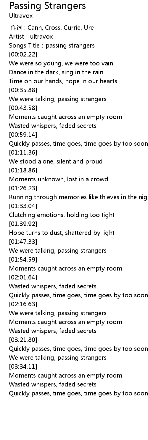 | [00:01.03] | Songs Title: passing strangers |