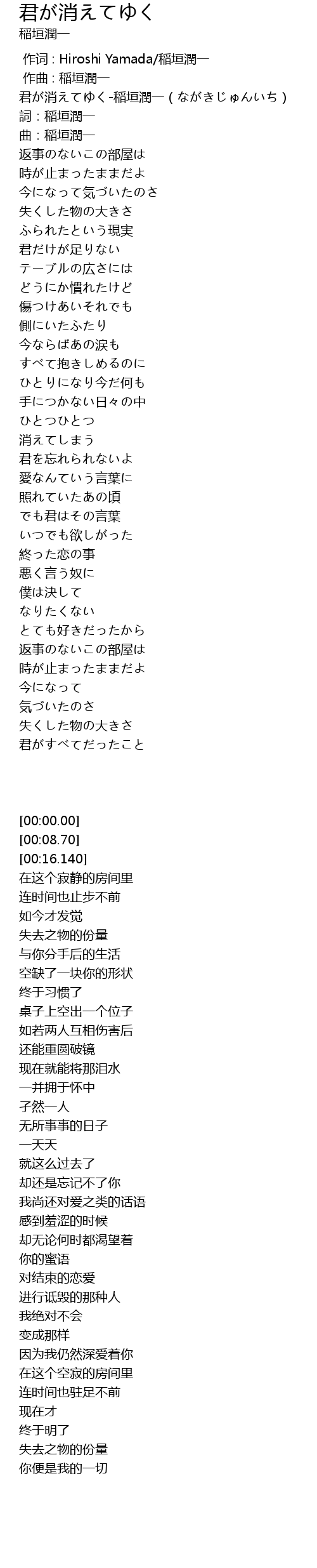 | [00:00.00] | 君が消えてゆく-稲垣潤一(ながきじゅんいち) |