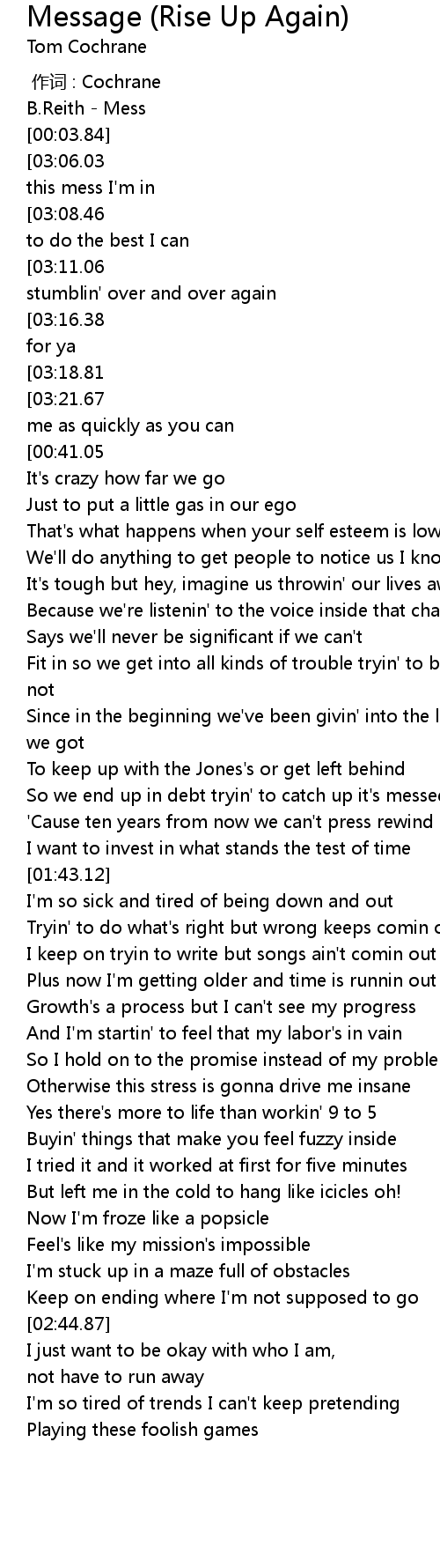 | [03:26.84][03:06.03][02:24.90][01:23.15][00:20.81][00:10.42] | Somebody get me out this mess I'm in |