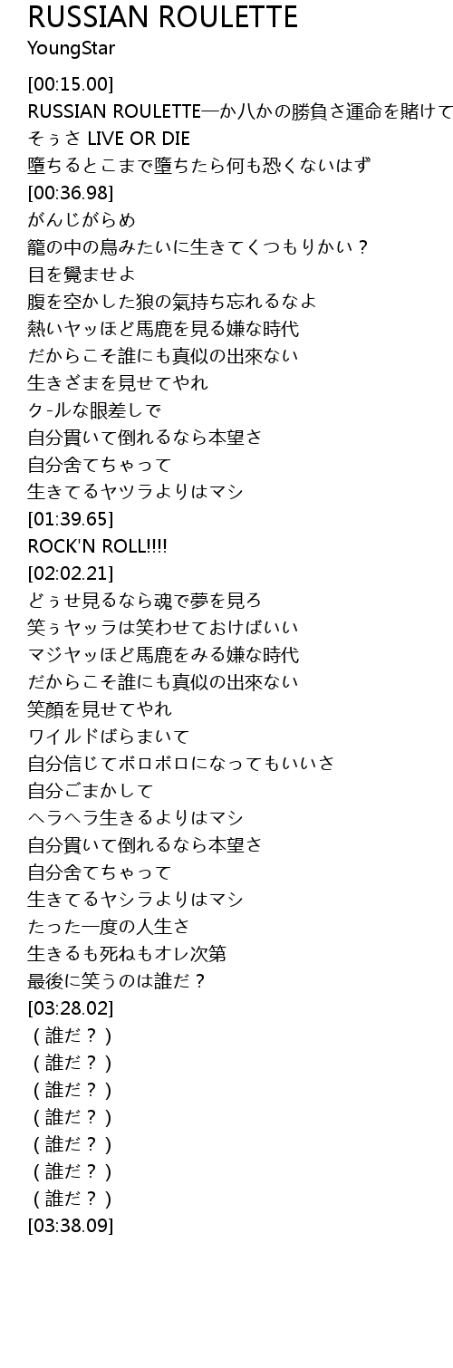 | [00:21.92] | RUSSIAN ROULETTE一か八かの勝負さ運命を賭けてみろ |
