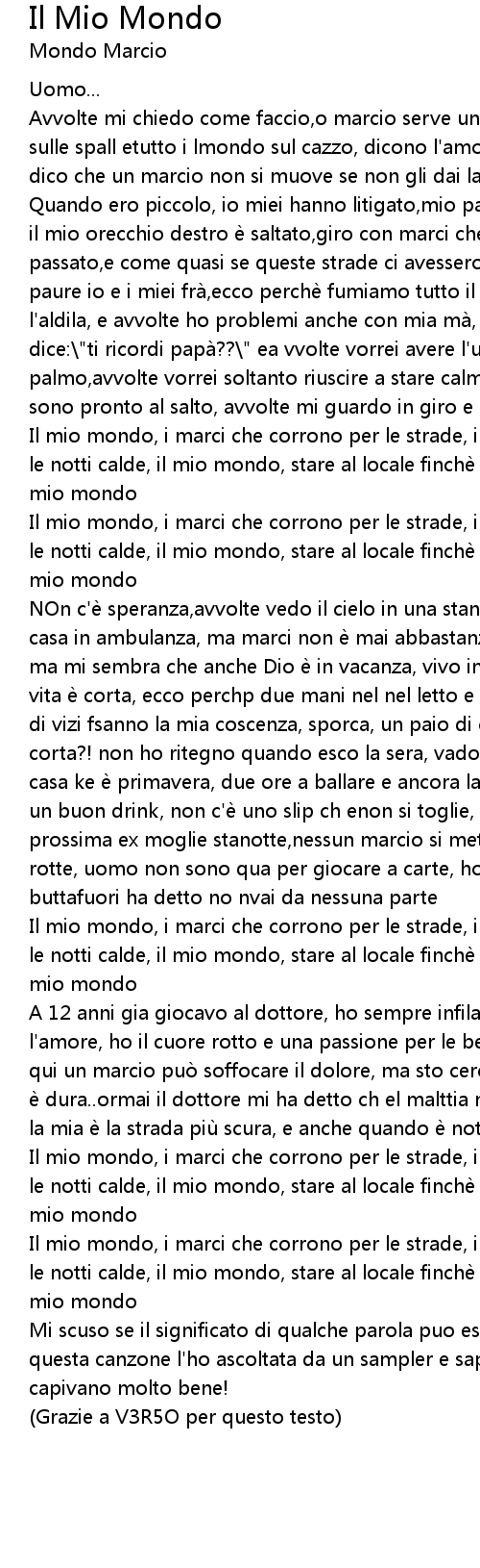 | Il mio mondo, i marci che corrono per le strade, il mio mondo, le belle signore le notti calde, il mio mondo, stare al locale finche non cade, il mio mondo, il mio mondo | |