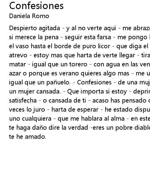 | Despierto agitada y al no verte aqui me abrazo a la almohada me pregunto si merece la pena seguir esta farsa me pongo la bata voy hacia el salon el vaso hasta el borde de puro licor que diga el alcohol lo que yo no me atrevo estoy mas que harta de verte llegar tirar la chaqueta y entrar a matar igual que un torero con agua en las venas a veces un beso y si por azar o porque es verano quieres algo mas me usas me dejas y dejas tirada igual que un pa uelo. Confesiones de una mujer cansada confesiones de un mujer cansada. Que importa si estoy deprimida o feliz si estoy satisfecha o cansada de ti acaso has pensado que soy como un mueble mil veces lo juro harta de esperar he estado dispuesta a dejarme llevar por uno cualquiera que me hablara al alma en este momento y en este lugar aunque te haga da o dire la verdad eres un pobre diablo y ya no te amo ni nunca te he amado. |