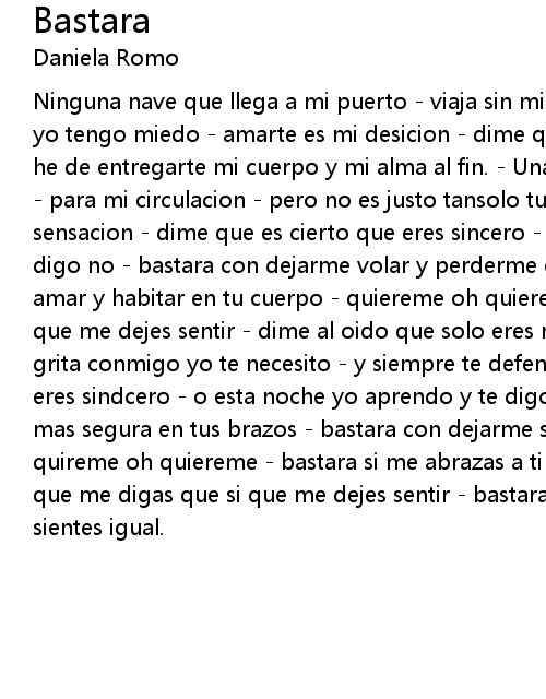| Ninguna nave que llega a mi puerto viaja sin mi corazon no eres culpable y yo tengo miedo amarte es mi desicion dime que es cierto que eres sincero y he de entregarte mi cuerpo y mi alma al fin. Una tormenta que me llueve dentro para mi circulacion pero no es justo tansolo tus ojos mueven esta sensacion dime que es cierto que eres sincero o esta noche yo aprendoo y te digo no bastara con dejarme volar y perderme en tu cielo bastara si me dejas amar y habitar en tu cuerpo quiereme oh quiereme bastara que me digas que si que me dejes sentir dime al oido que solo eres mio y nunca yo te operdere grita conmigo yo te necesito y siempre te defendere dime que es cierto que eres sindcero o esta noche yo aprendo y te digo no bastara si me dehas estar mas segura en tus brazos bastara con dejarme so ar cuando beso tus labios quireme oh quiereme bastara si me abrazas a ti si tu sientes igual bastara que me digas que si que me dejes sentir bastara si me abrazas a ti si tu sientes igual. |