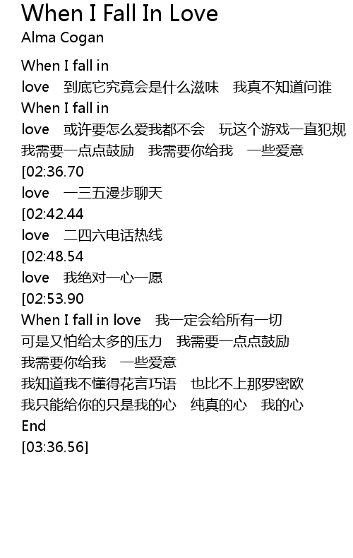| [03:00.32][02:36.70][01:46.26][00:47.67] | When I fall in love yi san wu man bu liao tian |