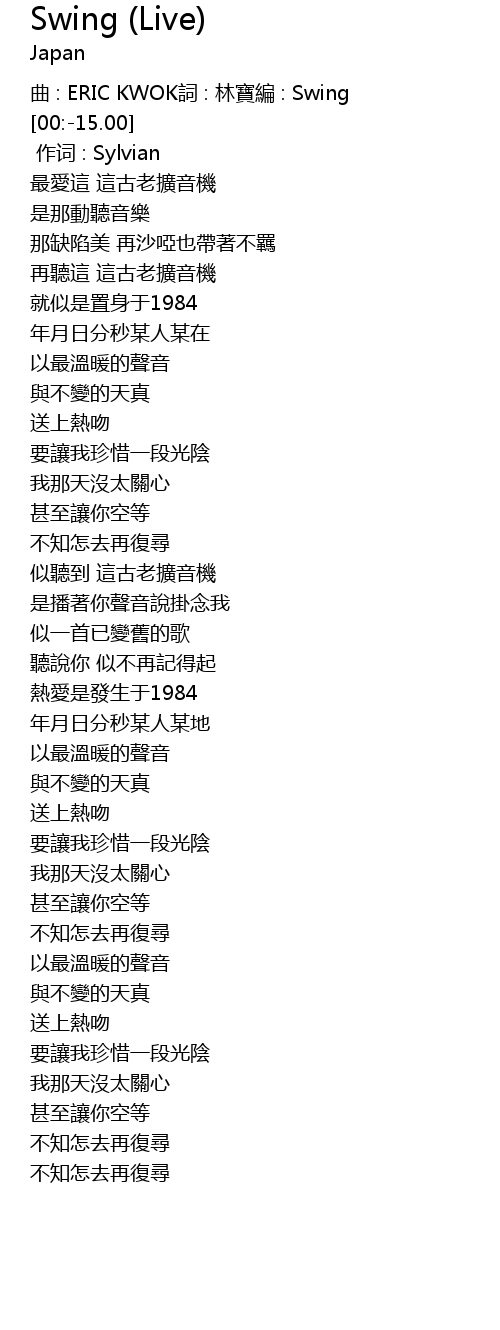 | [00:-17.00] | qu : ERIC KWOK ci : lin bao bian : Swing |