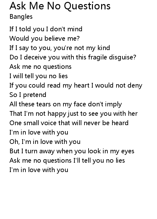 Ask me no questions I'll tell you no lies |