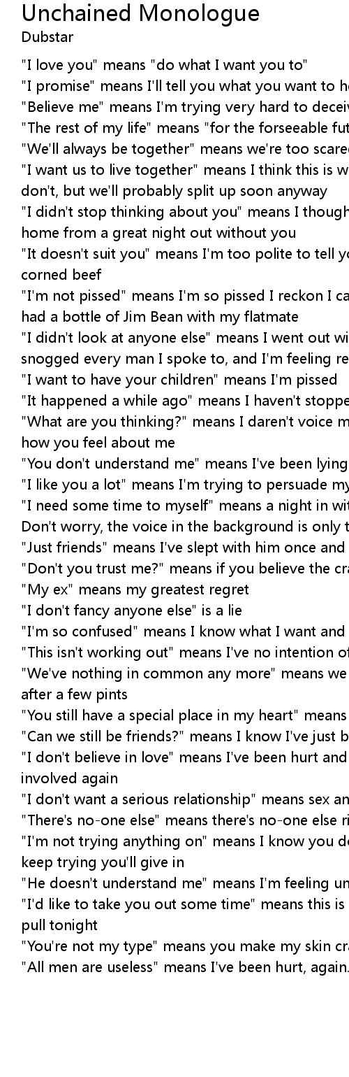 | "I like you a lot" means I'm trying to persuade myself that I do | |