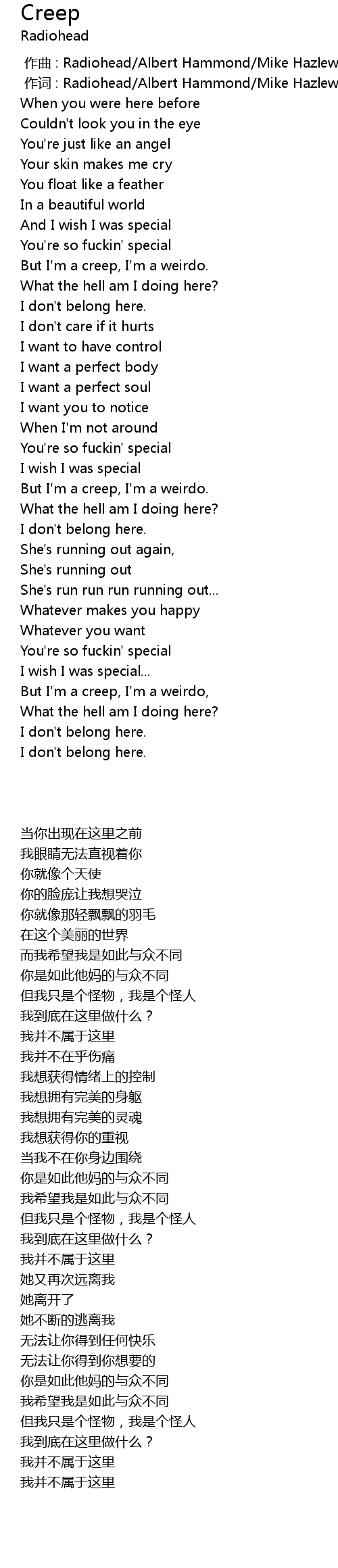 | [02:04.200] | But I' m a creep, I' m a weirdo. |