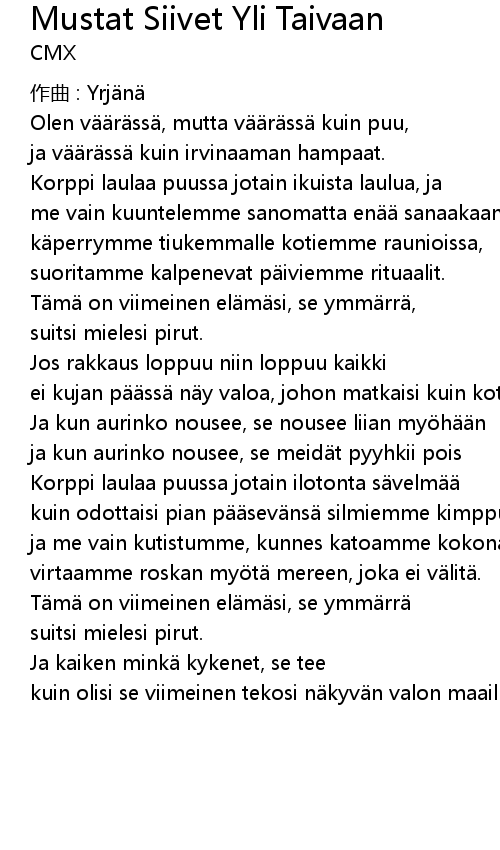 | Korppi laulaa puussa jotain ikuista laulua, ja | |