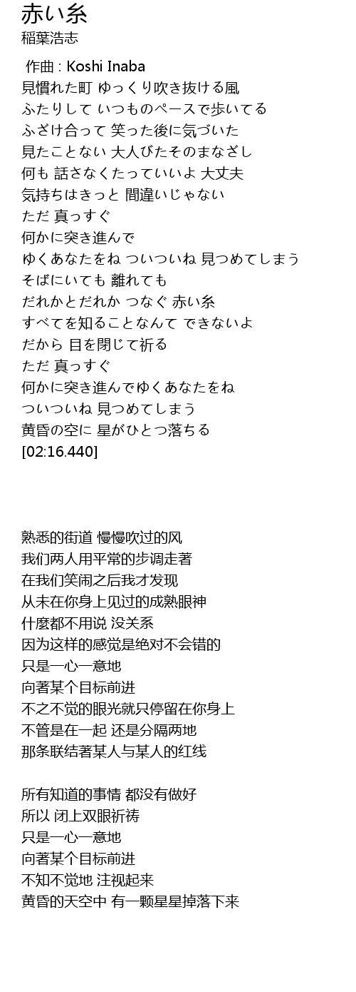 | [01:14.040] | だれかとだれか つなぐ 赤い糸 |