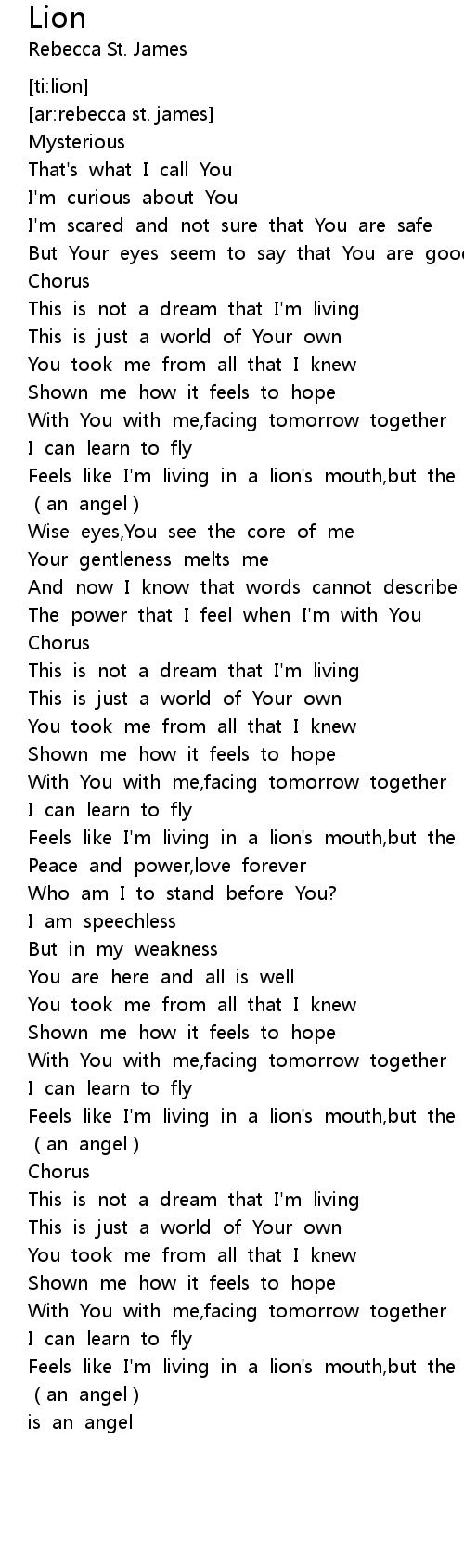 | [03:19.394] | Feels like I' m living in a lion' s mouth, but the lion is an angel |