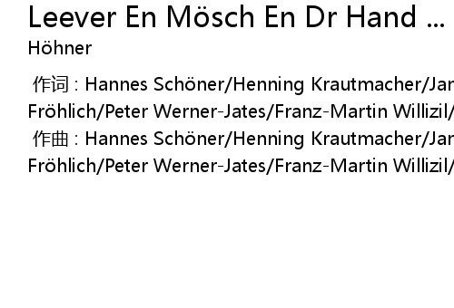 | [00:00.000] | 作词 : Hannes Schöner/Henning Krautmacher/Jan Peter Fröhlich/Peter Werner-Jates/Franz-Martin Willizil/Carl Friedrich Ingenmey |
