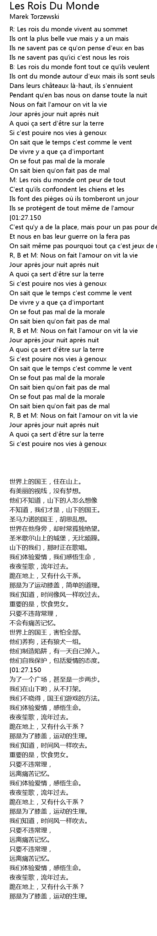| [00:36.800] | B: Les rois du monde font tout ce qu' ils veulent |