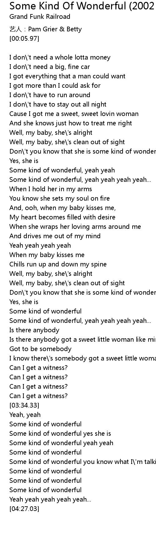 | [02:27.65] | Don\'t you know that she is some kind of wonderful |