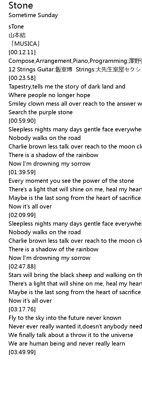 | [00:19.79] | 12 Strings Guitar:飯室博 Strings:大先生室屋セクシヨソ |