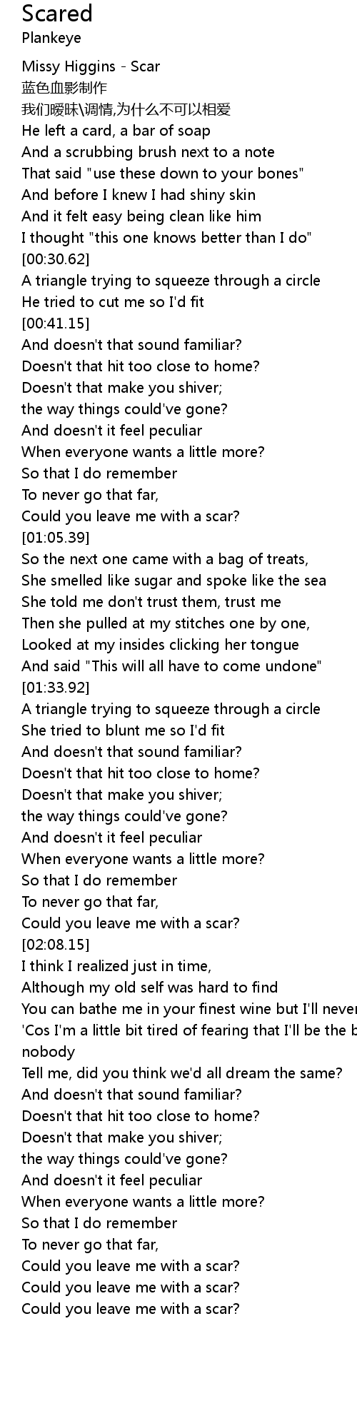 | [00:02.34] | Missy Higgins Scar |