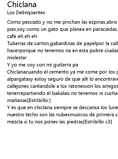 | Chiclanacuando el cemento ya me come por los piesbusco animales con chaqueta y alpargatasy estoy seguro de que alli lo encontrare eh eh ehvan por los callejones cantandole a los ratonesson los amigos que siempre yo quize tenerrepartiendo el bakalao no tenemos ni cucharame ducho, en la playa toas las ma anas Estribillo: | |