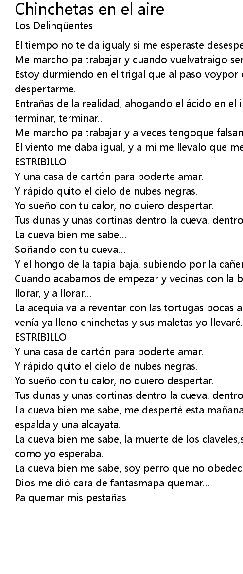 | La acequia va a reventar con las tortugas bocas arriba sin poner pie y el aire veni a ya lleno chinchetas y sus maletas yo llevare. | |