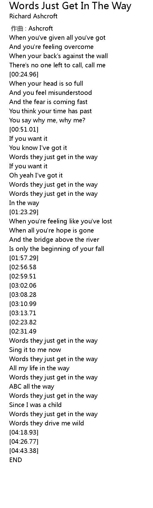 | [03:36.97][03:13.71][02:17.85] | Words they just get in the way |