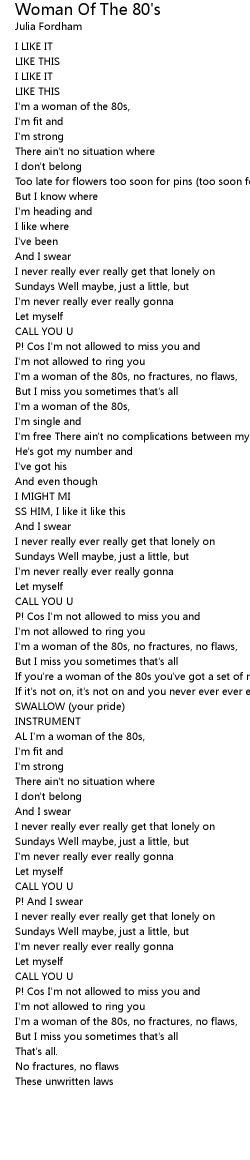 I'm a woman of the 80s, no fractures, no flaws, |