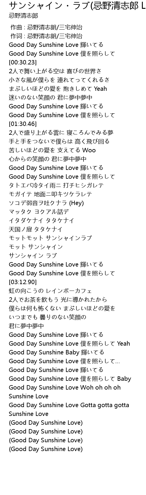 | [04:11.30] | Good Day Sunshine Love 僕を照らして Yeah |
