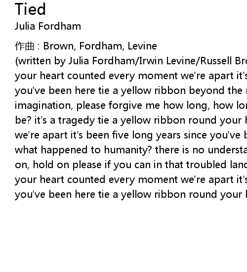 | written by Julia Fordham Irwin Levine Russell Brown tie a yellow ribbon round your heart counted every moment we' re apart it' s been five long years since you' ve been here tie a yellow ribbon beyond the realm of dignity beyond imagination, please forgive me how long, how long, how long, how long will it be? it' s a tragedy tie a yellow ribbon round your heart counted every moment we' re apart it' s been five long years since you' ve been here tie a yellow ribbon what happened to humanity? there is no understanding such insanity hold on, hold on, hold on please if you can in that troubled land tie a yellow ribbon round your heart counted every moment we' re apart it' s been five long years since you' ve been here tie a yellow ribbon round your heart |