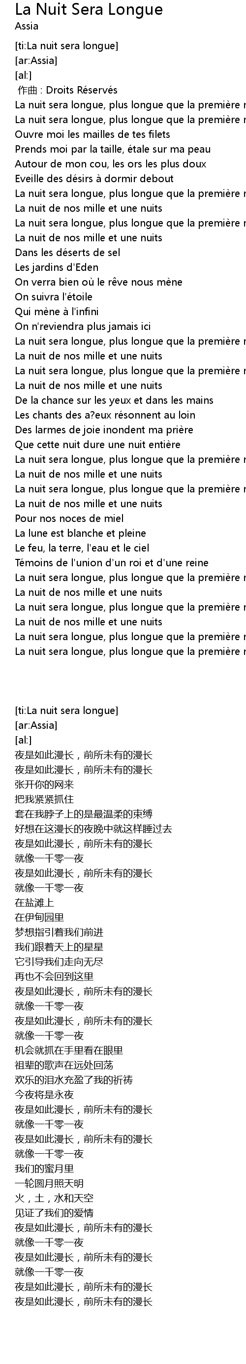 | [03:38.48] | La nuit sera longue, plus longue que la premiè re nuit du monde |