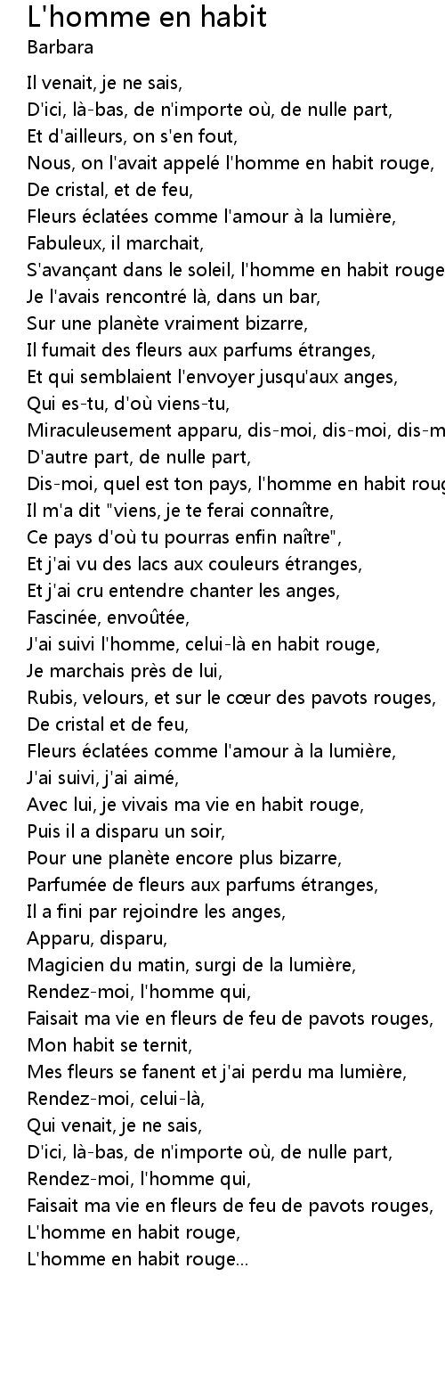 | J' ai suivi l' homme, celuila en habit rouge, | |