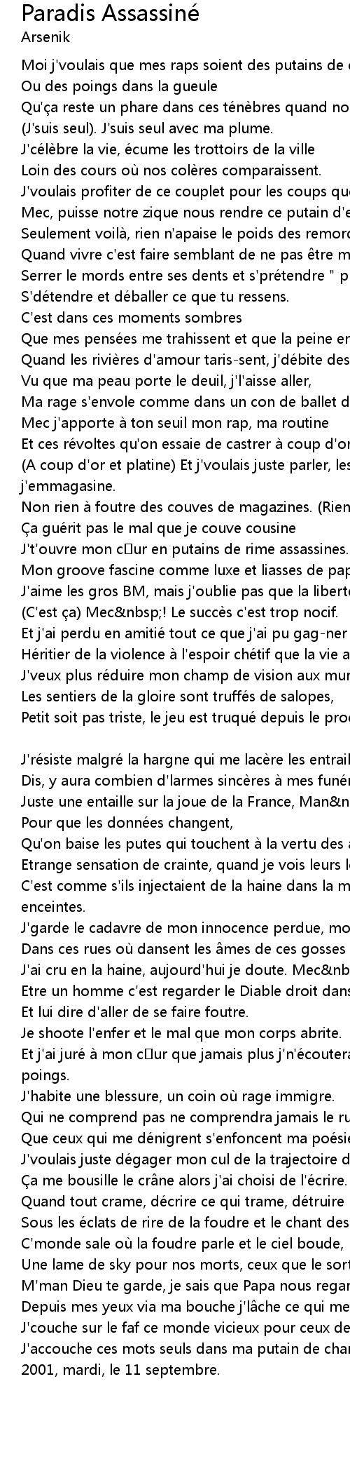 | J't'ouvre mon cur en putains de rime assassines. | |