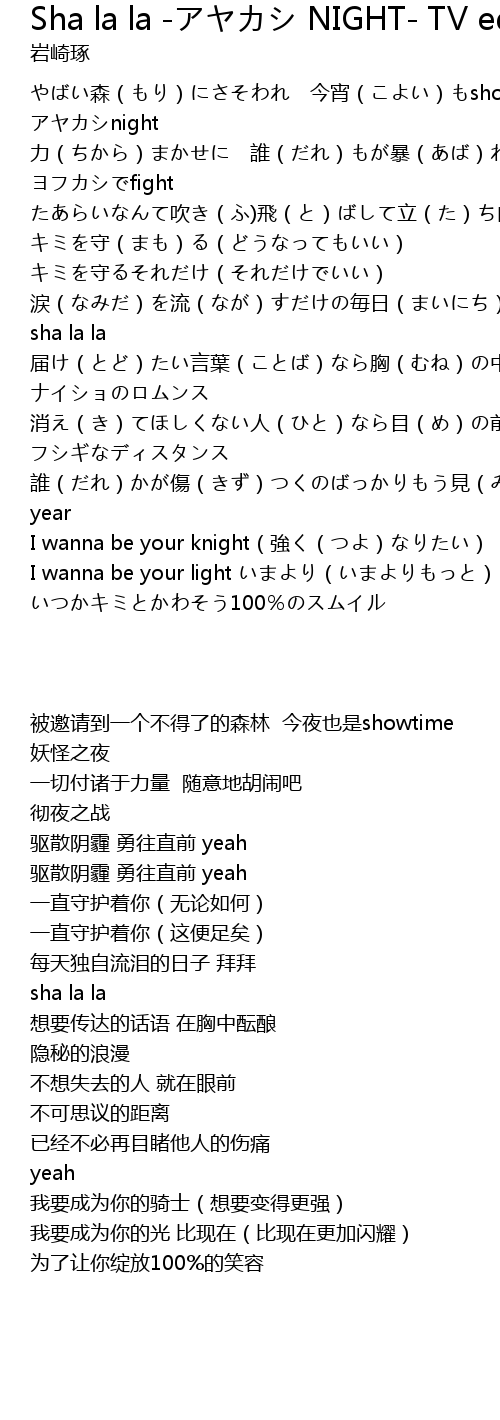 | [01:16.00] | I wanna be your knight(強く(つよ)なりたい) |