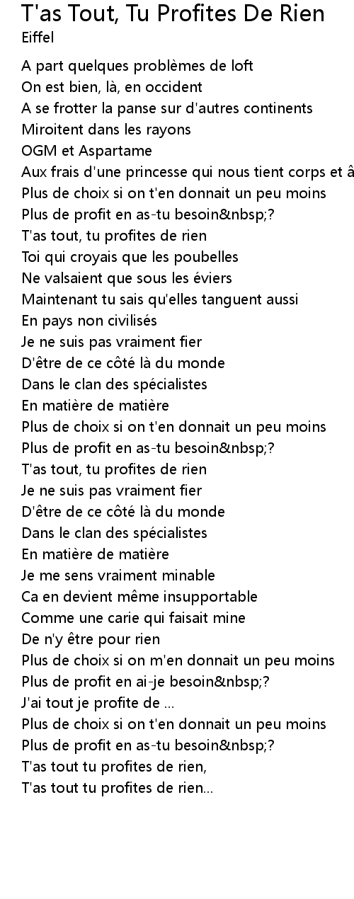| Song | T'as Tout, Tu Profites De Rien |
