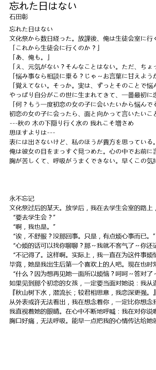 | [02:35.95] | 俺は彼女の目をまっすぐ見つめた。心の中でお前に言ってるんだ。お前が俺の初恋なんだと、何度も呼びかけた。 |